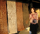 鳴門では、大物のカメや寝ロクロで有名な「大谷焼」の窯元、藍草から7色を染めていらっしゃる自然染色研究家 アキヤマセイコ先生の工房を訪ねました。これも藍染めかと思うような斬新な作品をたくさん見せていただき、「柿渋」で染めた麻布に、「沈殿藍」を顔料として、文字を書かせていただくという僥倖に与りました。75歳とは思えないアキヤマ先生の意欲的で誠実な仕事振りに触れ、私もこうありたいと意を強くしました。