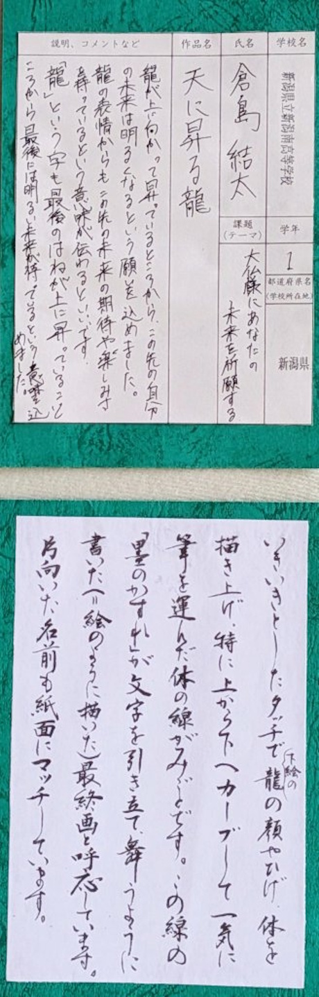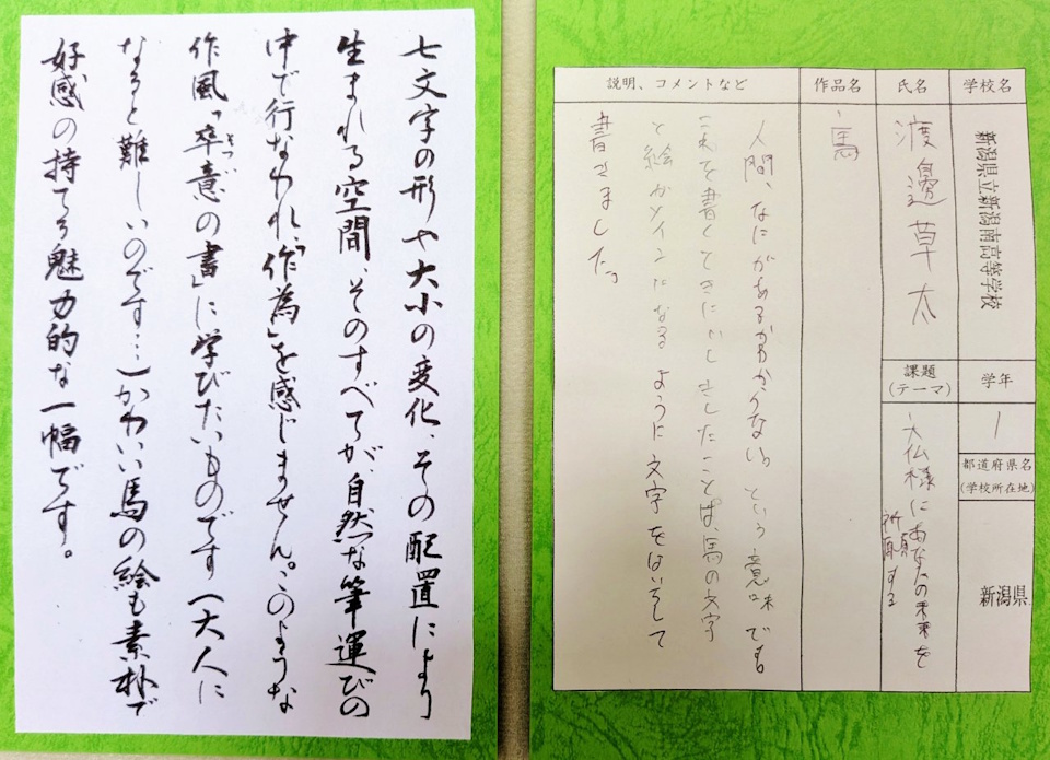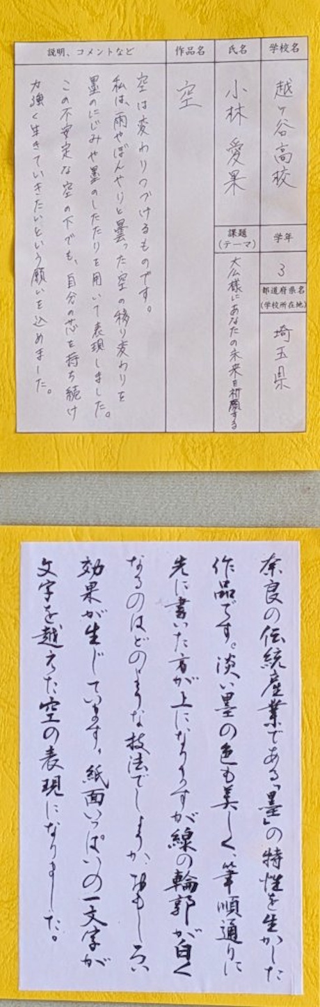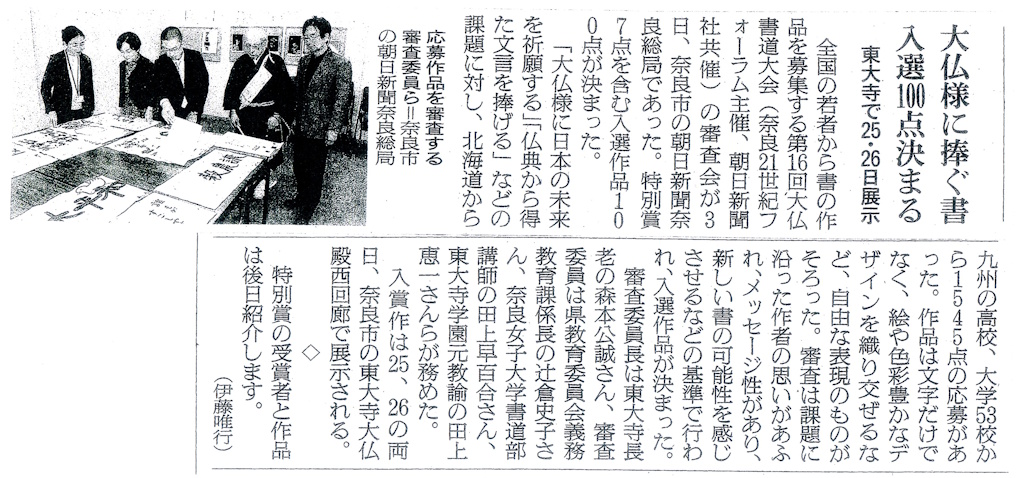 朝日新聞奈良版の記事です。特別賞の7点は、「大仏書道展」の趣旨が伝わるような作品を選んでいます。右上から順に「金字の祈り」(講評)、その下「隼人の思い」(講評)、「大仏様のほほえみ」(講評)、中央上「いれものがない 両手で受ける」(講評)、その下「空」(講評)、左上「天に昇る龍」(講評)、その下「馬」(講評)です。※その他の入選作品
