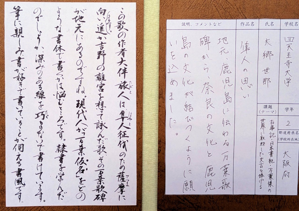 写真1枚目は、入り口の「西楽門」の看板、2枚目は会場の様子です。西回廊からは、大仏殿や中門、若草山を望むことができ、大仏殿拝観は有料ですが、西回廊の展示は自由にご観覧いただけます。毎年楽しみにしていると言って見てくださる方も増え、作品を応募した遠方からのご家族や観光客の方々もありました。