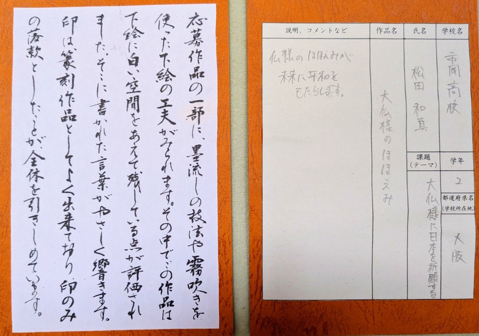 3日(金)は、共催「朝日新聞社」の奈良総局にて、審査委員長の東大寺森本長老を中心に「本審査」を行ないました。入選作品100点(うち特別賞7点)を選びました。作者の思いが詰まったコメント欄も読みながら、審査基準に基づいて選んだ結果、1点も入選しない学校がたくさんありました。懲りずに応募していただきたいと願っています。※新聞記事