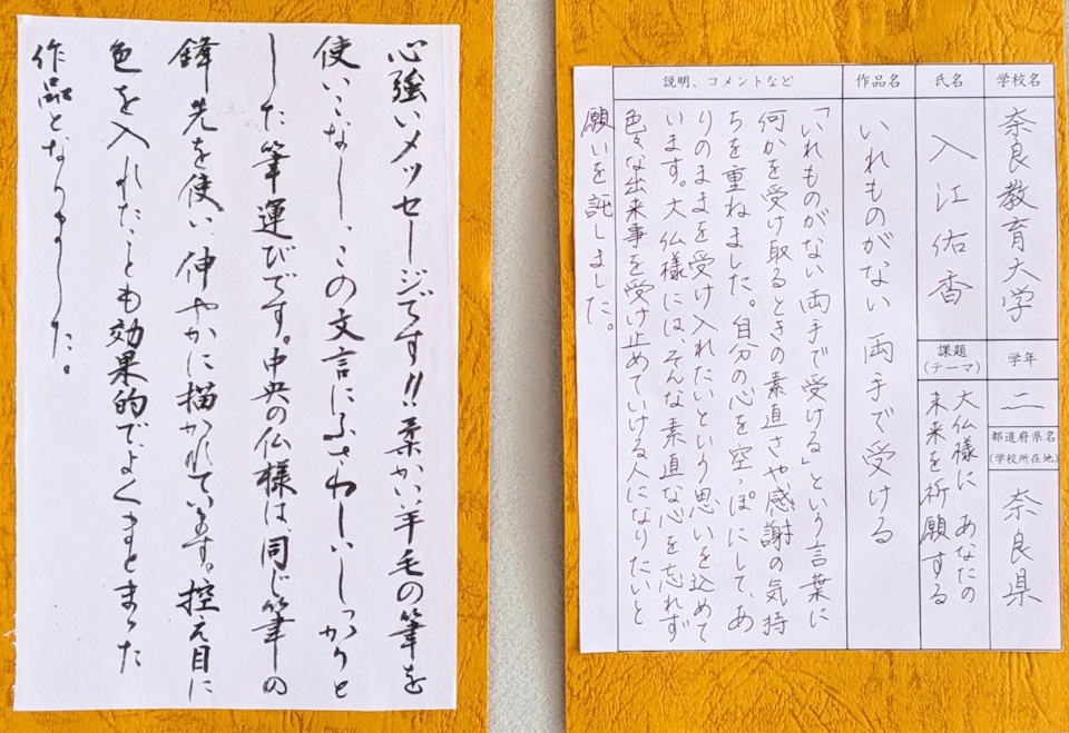NPO法人「奈良21世紀フォーラム」主催の奈良に相応しい書のイベント「大仏書道大会 ~書くことは楽しいin奈良~ 」に協力しています。2010年の「平城遷都1300年祭」の記念行事として始まり、今年で16回目になりました。※作品応募のお願い・事業内容・募集要項・審査基準