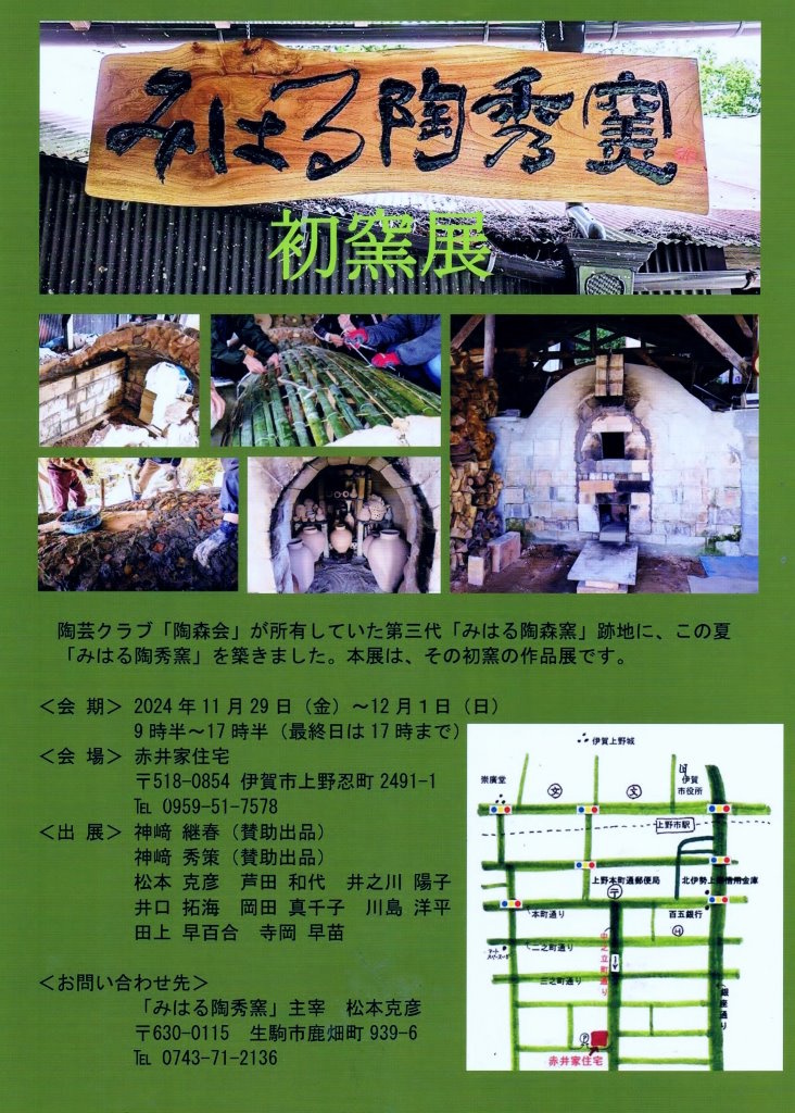 11月29日(金)~12月1日(日)、「みはる陶秀窯」の「初窯展」を開催しました。会場は、三重県登録有形文化財「赤井家住宅」(伊賀市)です。信楽にある窯元「みはる窯」の敷地内に、松本陶剋さんが穴窯を築窯され、10月に初めての窯焚きをしました。その一連の活動に関わったメンバー8名の作品展です。